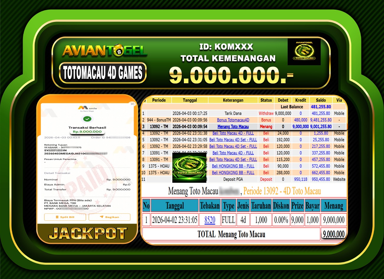 BUKTI PEMBAYARAN AVIANTOGEL Rp.9,000,000,- GAME : TOGEL TOTOMACAU 4D GAMES