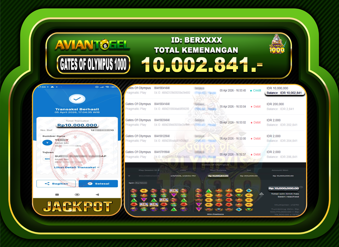 BUKTI PEMBAYARAN SLOT AVIANTOGEL Rp.10,002,841,- GAME : SLOT GATES OF OLYMPUS 1000
