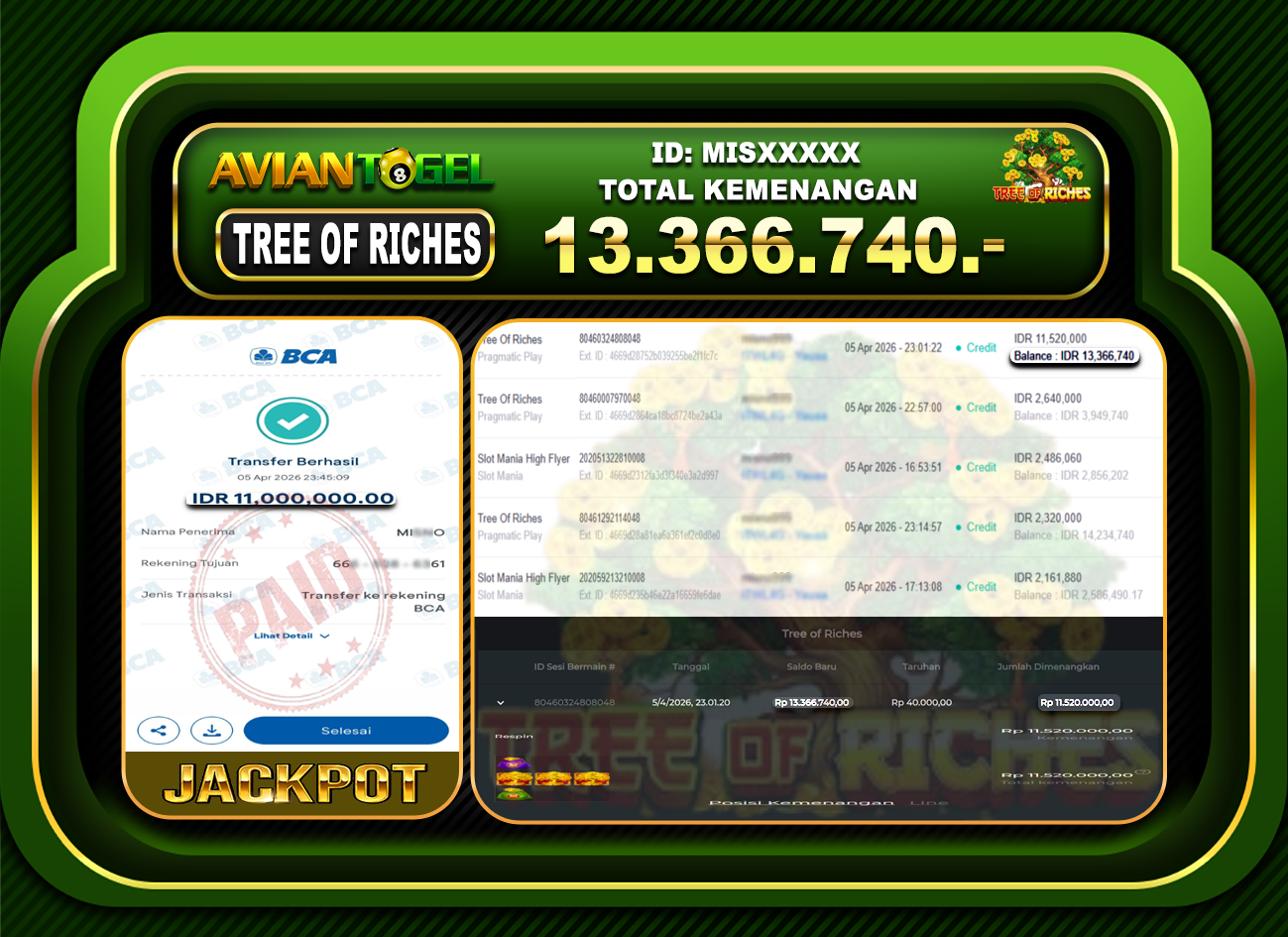 BUKTI PEMBAYARAN SLOT AVIANTOGEL Rp.13,366,740,- GAME : SLOT TREE OF RICHES