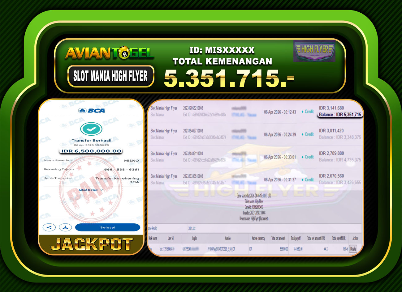 BUKTI PEMBAYARAN SLOT AVIANTOGEL Rp.5,351,715,- GAME : SLOT MANIA HIGH FLYER