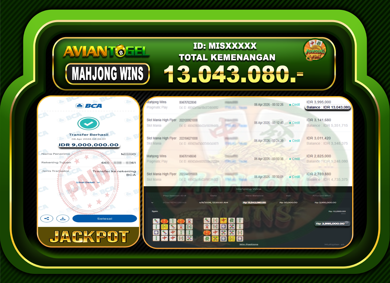 BUKTI PEMBAYARAN SLOT AVIANTOGEL Rp.13,043,080,- GAME : SLOT MAHJONG WINS
