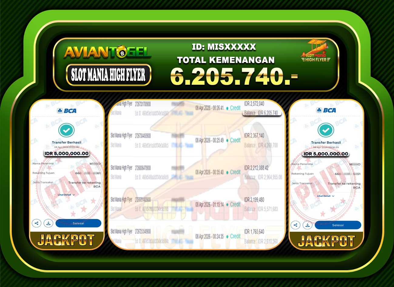 BUKTI PEMBAYARAN SLOT AVIANTOGEL Rp.6,205,740,- GAME : SLOT MANIA HIGH FLYER
