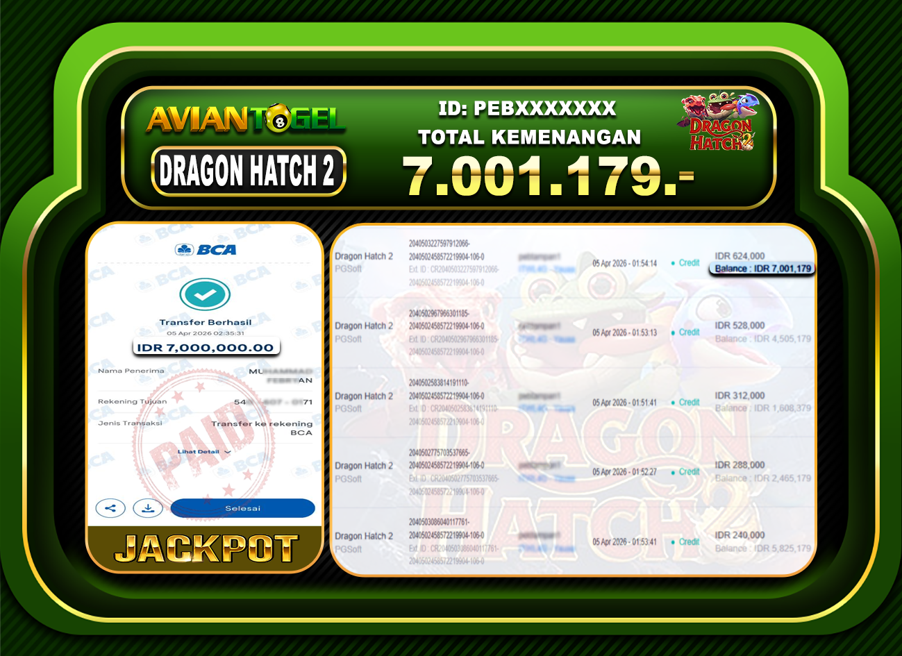 BUKTI PEMBAYARAN SLOT AVIANTOGEL Rp.7,001,179,- GAME : SLOT DRAGON HATCH 2