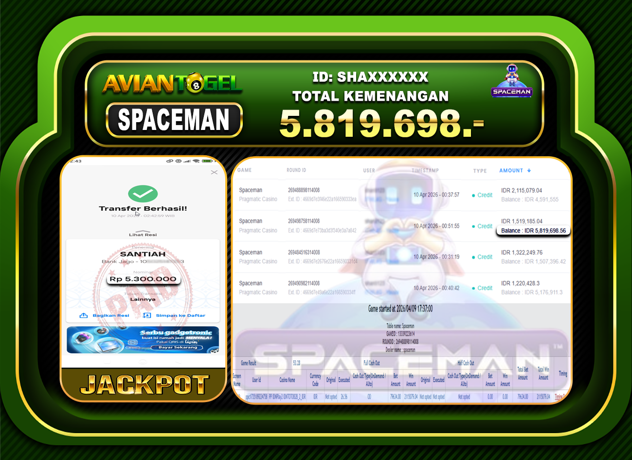 BUKTI PEMBAYARAN SLOT AVIANTOGEL Rp.5,819,698,- GAME : SLOT SPACEMAN