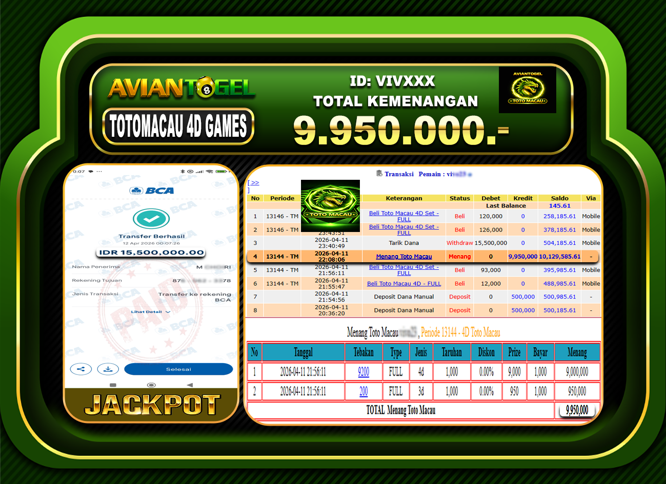 BUKTI PEMBAYARAN AVIANTOGEL Rp.9,950,000,- GAME : TOGEL TOTOMACAU 4D GAMES