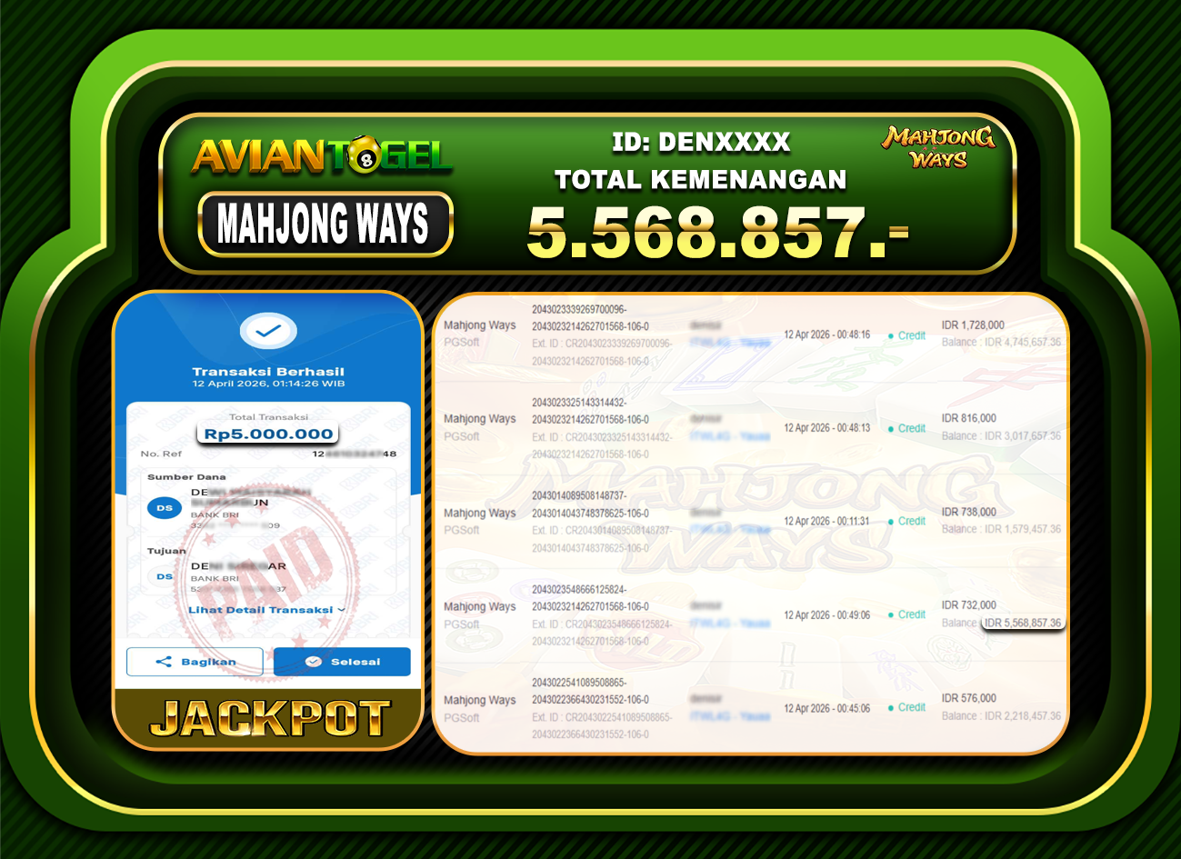 BUKTI PEMBAYARAN SLOT AVIANTOGEL Rp.5,568,857,- GAME : SLOT MAHJONG WAYS