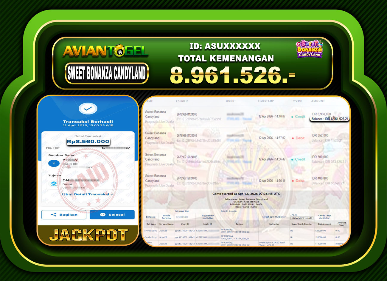 BUKTI PEMBAYARAN SLOT AVIANTOGEL Rp.8,961,526,- GAME : SLOT SWEET BONANZA CANDYLAND