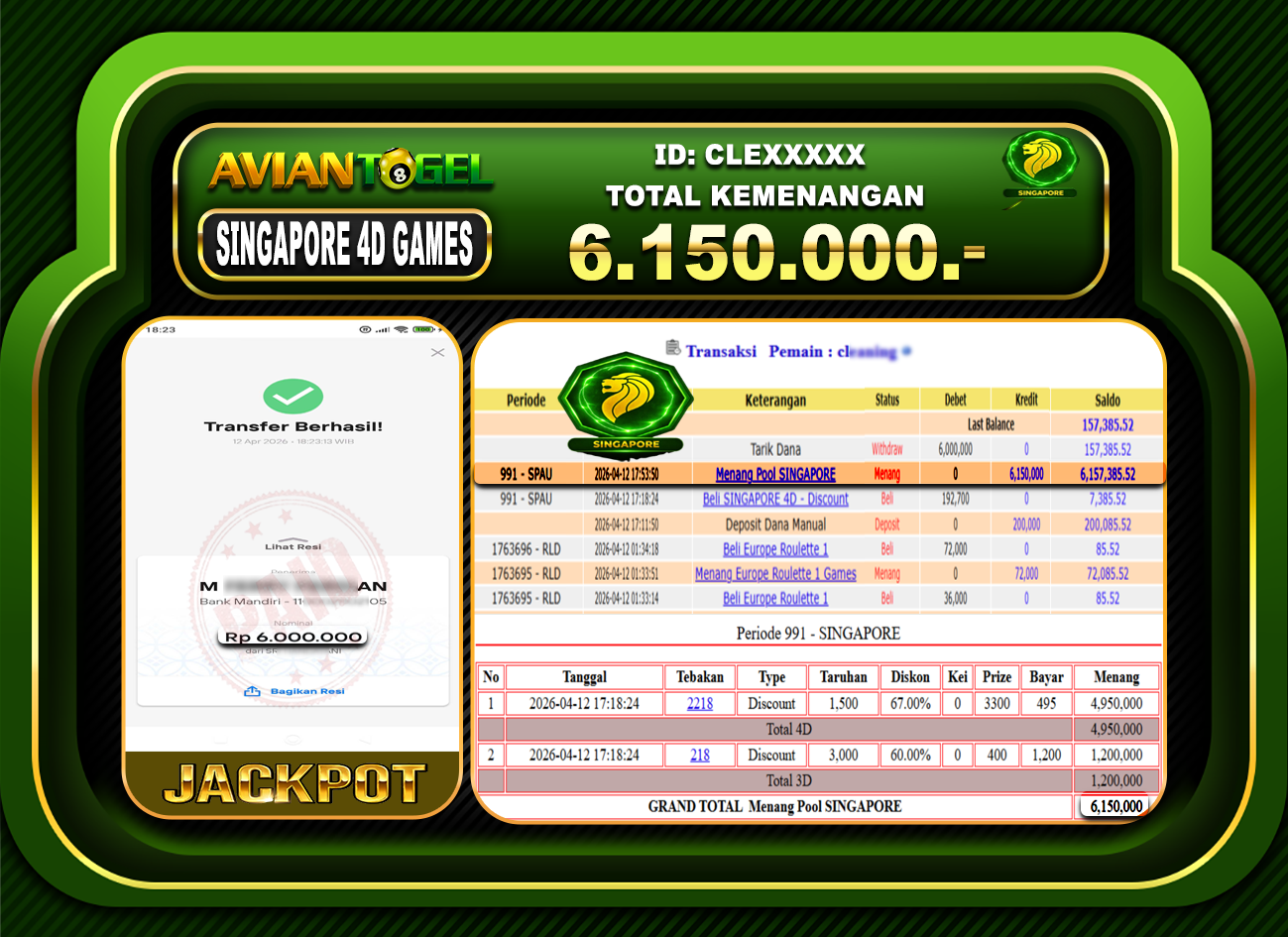 BUKTI PEMBAYARAN AVIANTOGEL Rp.6,150,000,- GAME : TOGEL SINGAPORE 4D GAMES