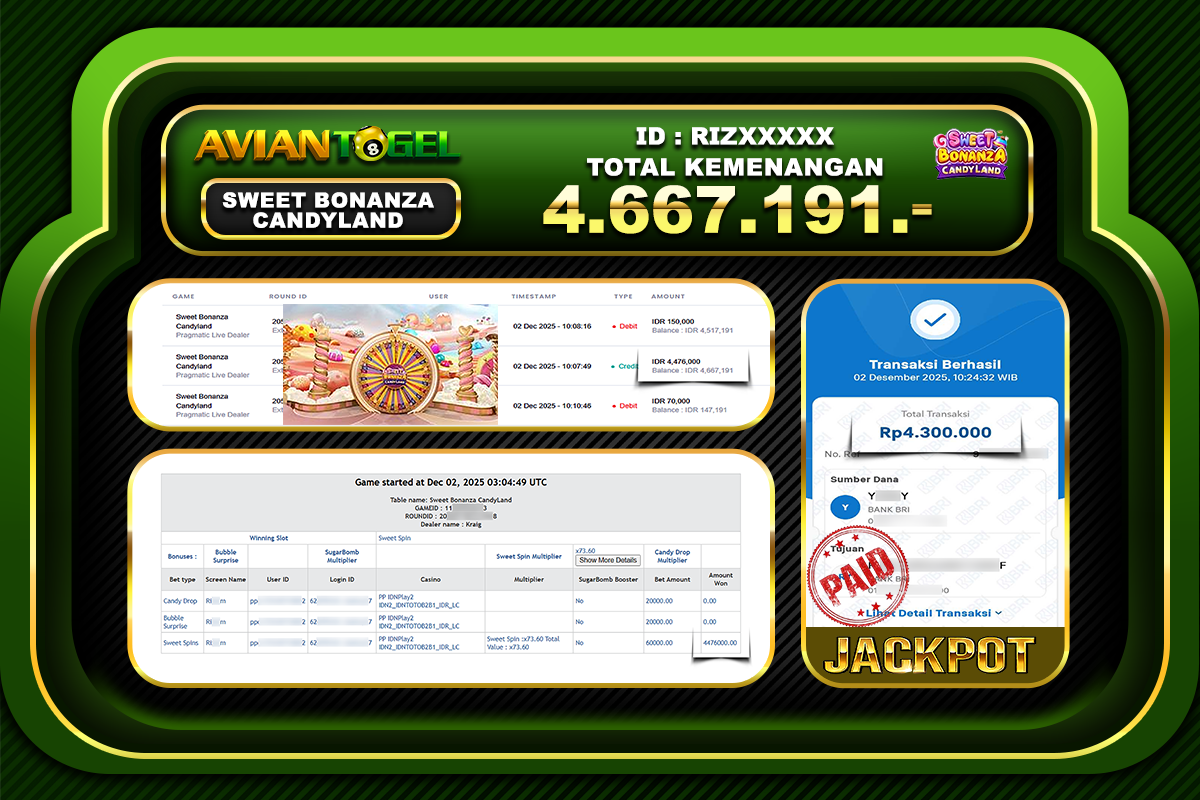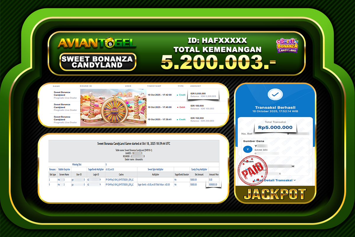BUKTI PEMBAYARAN SLOT AVIANTOGEL Rp.5,200,003,- GAME : SLOT SWEET BONANZA CANDYLAND