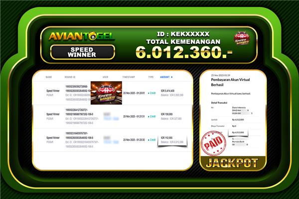 BUKTI PEMBAYARAN SLOT AVIANTOGEL Rp.6,012,360,- GAME : SLOT SPEED WINNER