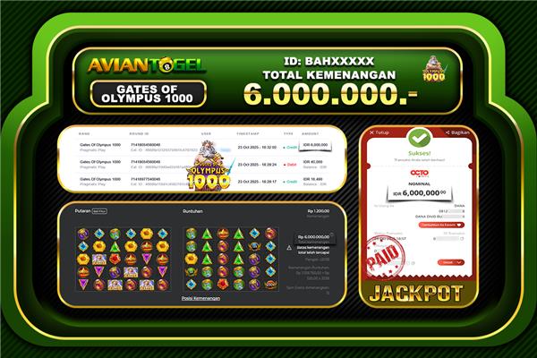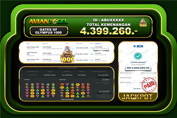 Beberapa situs togel online hanya menjanjikan tanpa ada bukti yang jelas, tapi di AVIANTOGEL semua pasti terbukti dan jelas, BUKTI JACKPOT TOTO TOGEL ONLINE, SLOT ONLINE, LIVE CASINO secara nyata. Melalui kemenangan member setiap hari nya, jackpot besar togel online 2D–3D–4D maupun jackpot besar slot gacor, hingga bukti transaksi kemenangan yang benar-benar masuk ke saldo member.