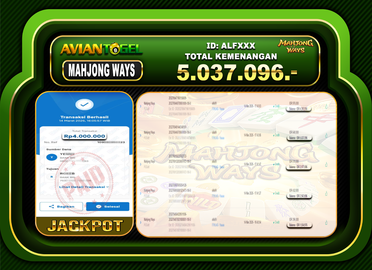 BUKTI PEMBAYARAN SLOT AVIANTOGEL Rp.5,037,096,- GAME : SLOT MAHJONG WAYS