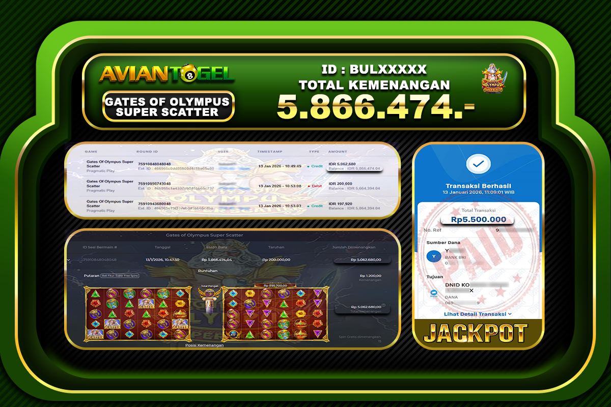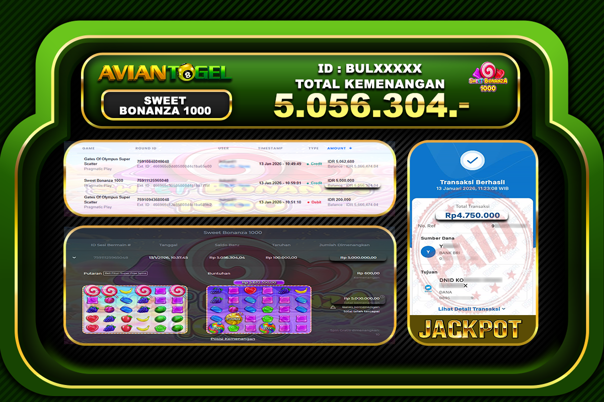 Beberapa situs togel online hanya menjanjikan tanpa ada bukti yang jelas, tapi di AVIANTOGEL semua pasti terbukti dan jelas, BUKTI JACKPOT TOTO TOGEL ONLINE, SLOT ONLINE, LIVE CASINO secara nyata. Melalui kemenangan member setiap hari nya, jackpot besar togel online 2D–3D–4D maupun jackpot besar slot gacor, hingga bukti transaksi kemenangan yang benar-benar masuk ke saldo member.