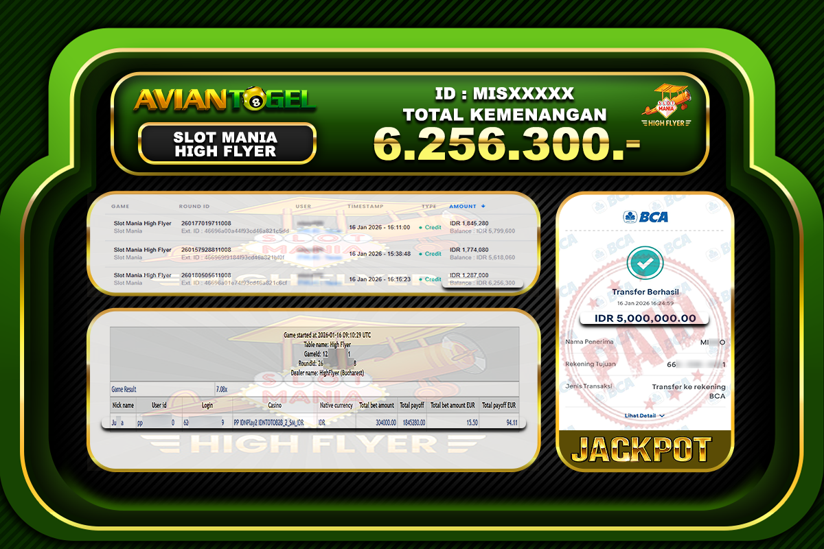 BUKTI PEMBAYARAN SLOT AVIANTOGEL Rp.6,256,300,- GAME : SLOT MANIA HIGH FLYER