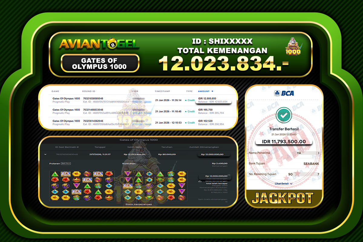 BUKTI PEMBAYARAN SLOT AVIANTOGEL Rp.12,023,834,- GAME : SLOT GATES OF OLYMPUS 1000