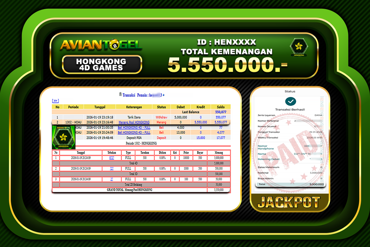 BUKTI PEMBAYARAN AVIANTOGEL Rp.5,550,000,- GAME : TOGEL HONGKONG 4D GAMES