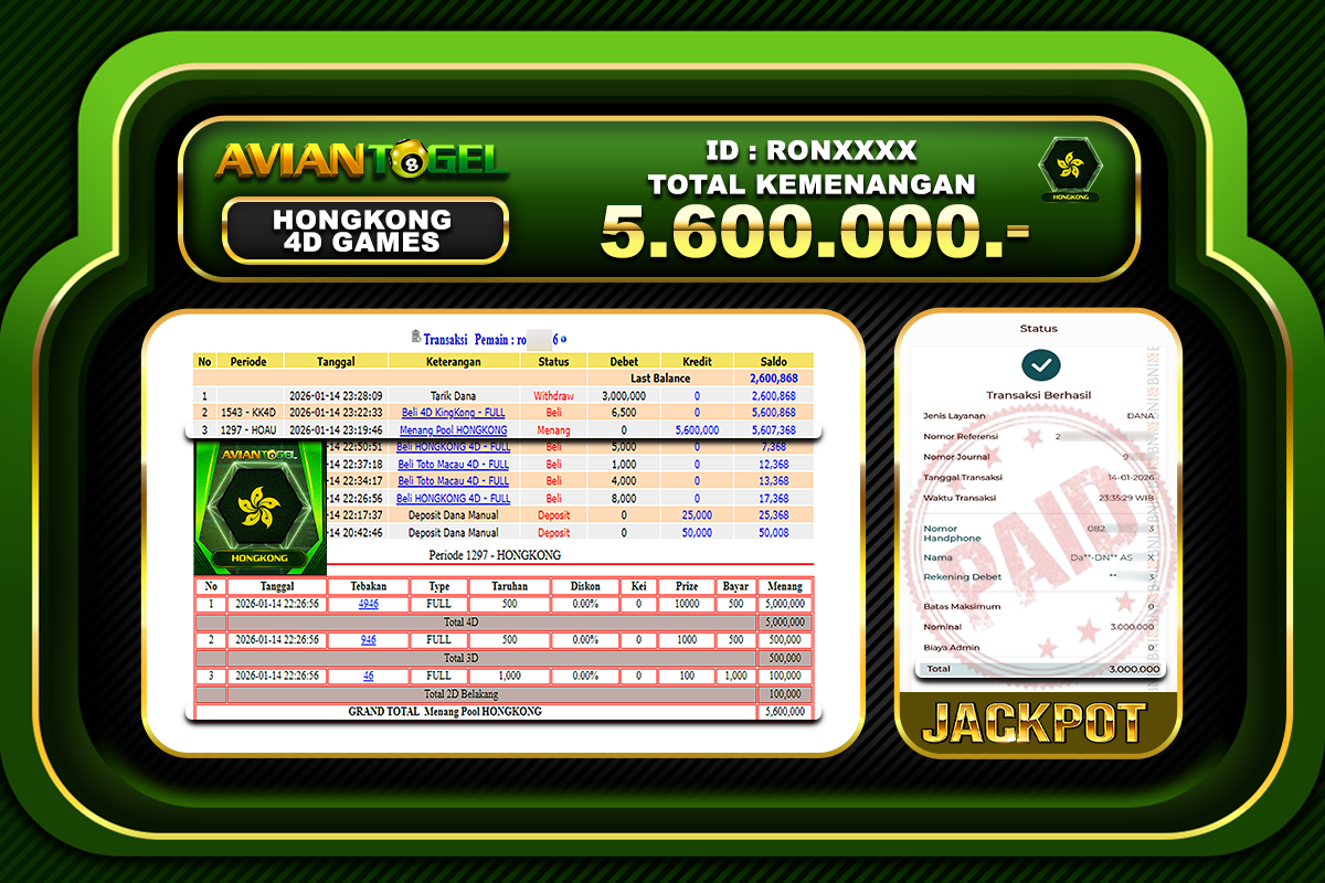 BUKTI PEMBAYARAN AVIANTOGEL Rp.5,600,000,- GAME : TOGEL HONGKONG 4D GAMES