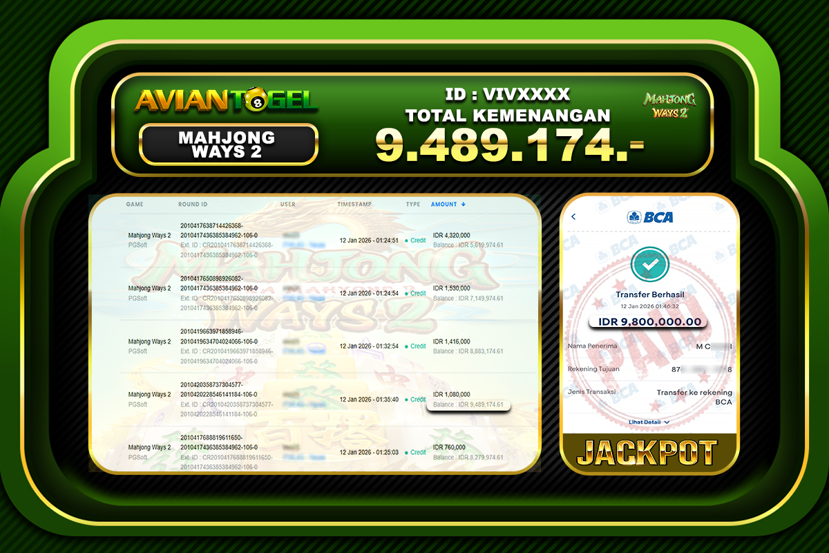 BUKTI PEMBAYARAN SLOT AVIANTOGEL Rp.9,489,174,- GAME : SLOT MAHJONG WAYS 2