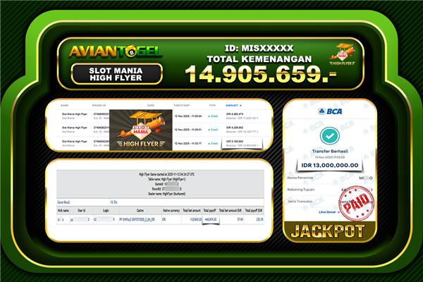 BUKTI PEMBAYARAN SLOT AVIANTOGEL Rp.14,905,659,- GAME : SLOT MANIA FLYER
