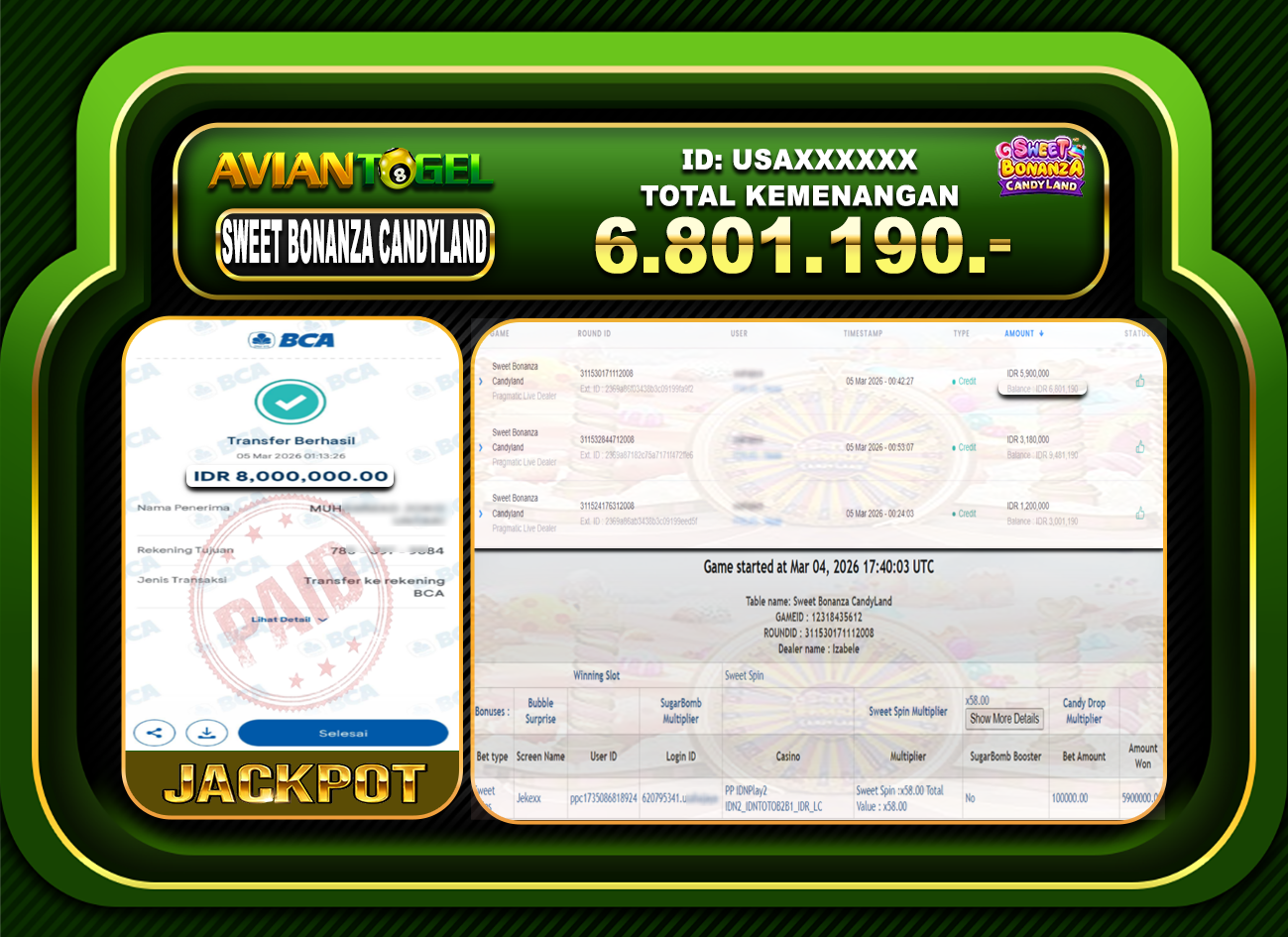 BUKTI PEMBAYARAN SLOT AVIANTOGEL Rp.50,000,000,- GAME : SWEET BONANZA CANDYLAND