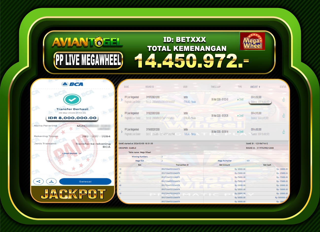 BUKTI PEMBAYARAN SLOT AVIANTOGEL Rp.14,450,972,- GAME : SLOT PP LIVE MEGA WHELL