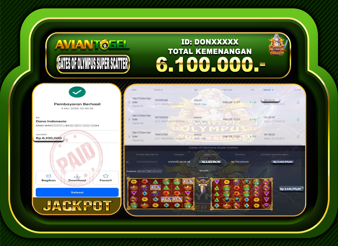 BUKTI PEMBAYARAN SLOT AVIANTOGEL Rp.6,100,000,- GAME : SLOT GATES OF OLYMPUS SUPER SCATTER