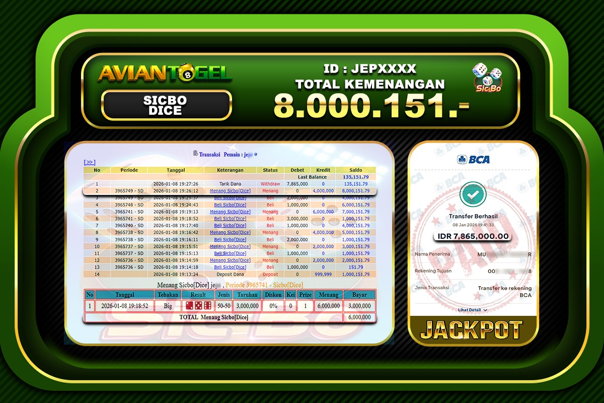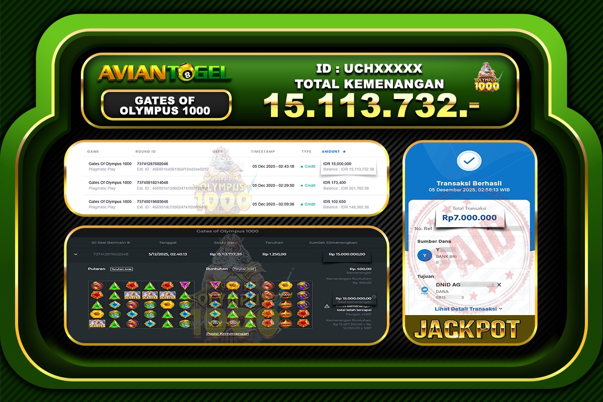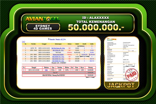 Beberapa situs togel online hanya menjanjikan tanpa ada bukti yang jelas, tapi di AVIANTOGEL semua pasti terbukti dan jelas, BUKTI JACKPOT TOTO TOGEL ONLINE, SLOT ONLINE, LIVE CASINO secara nyata. Melalui kemenangan member setiap hari nya, jackpot besar togel online 2D–3D–4D maupun jackpot besar slot gacor, hingga bukti transaksi kemenangan yang benar-benar masuk ke saldo member.