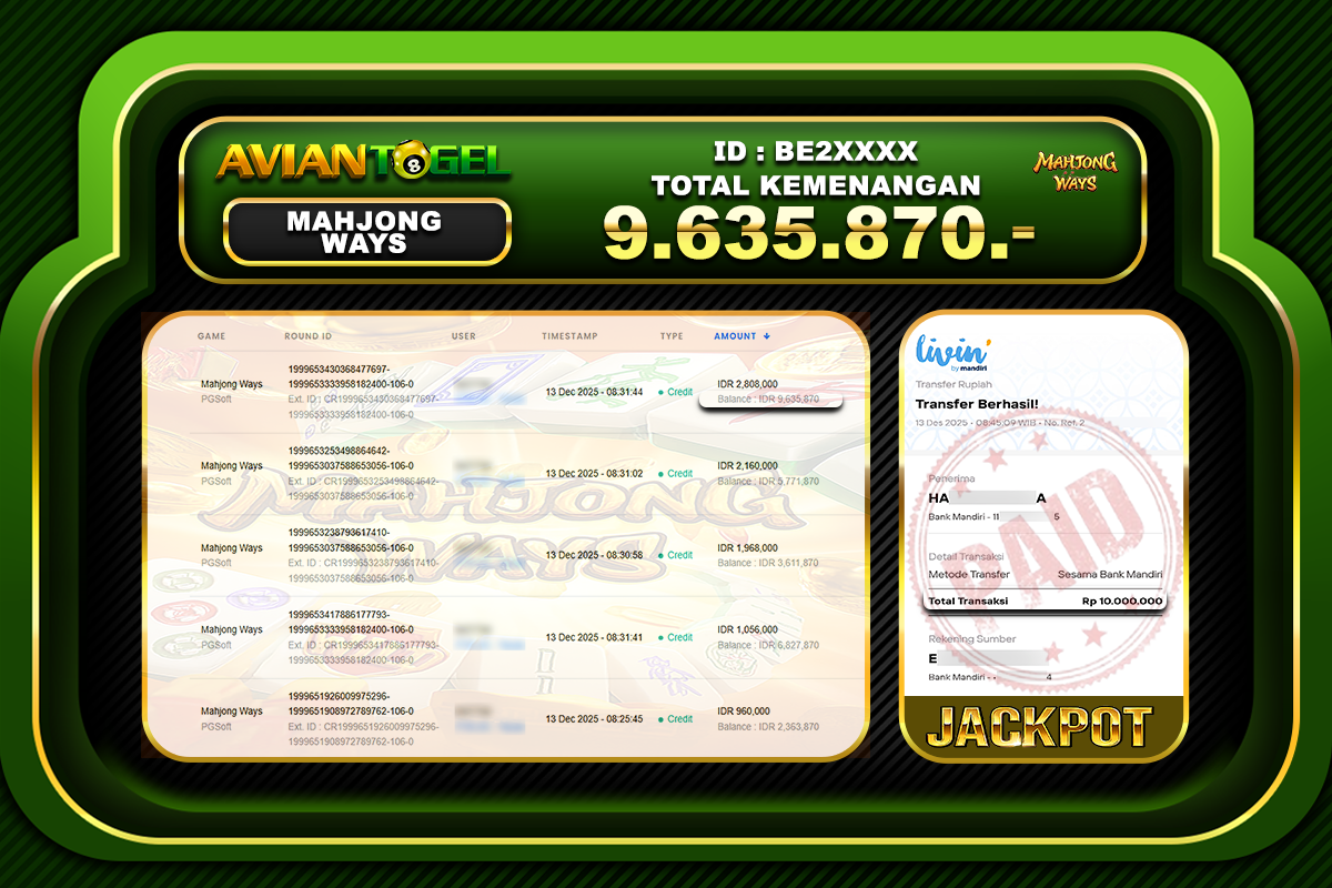 BUKTI PEMBAYARAN SLOT AVIANTOGEL Rp.9,635,870,- GAME : SLOT MAHJONG WAYS