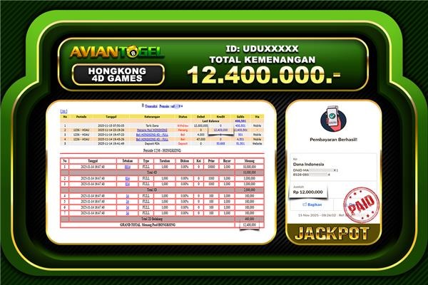 BUKTI PEMBAYARAN AVIANTOGEL Rp.12,400,000,- GAME : TOGEL HONGKONG 4D GAMES