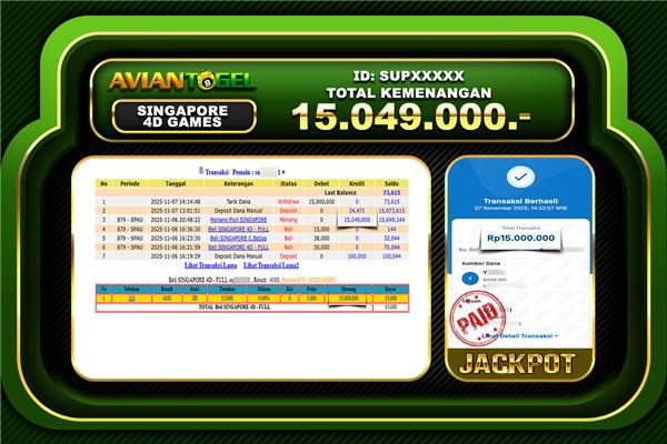 BUKTI PEMBAYARAN SLOT AVIANTOGEL Rp.15,049,000,- GAME : TOGEL SINGAPORE 4D GAMES