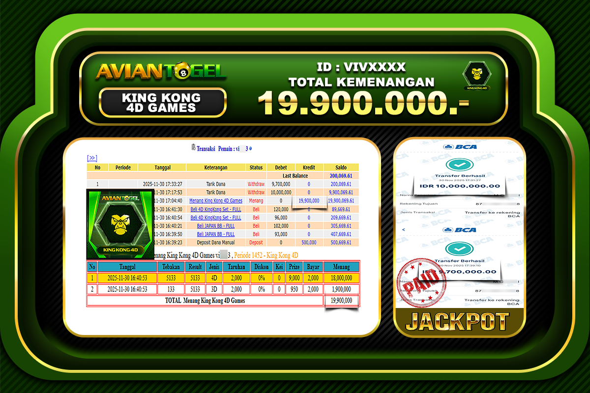 BUKTI PEMBAYARAN TOGEL KING KONG4D GAMES Rp.19,900,000, - LUNAS