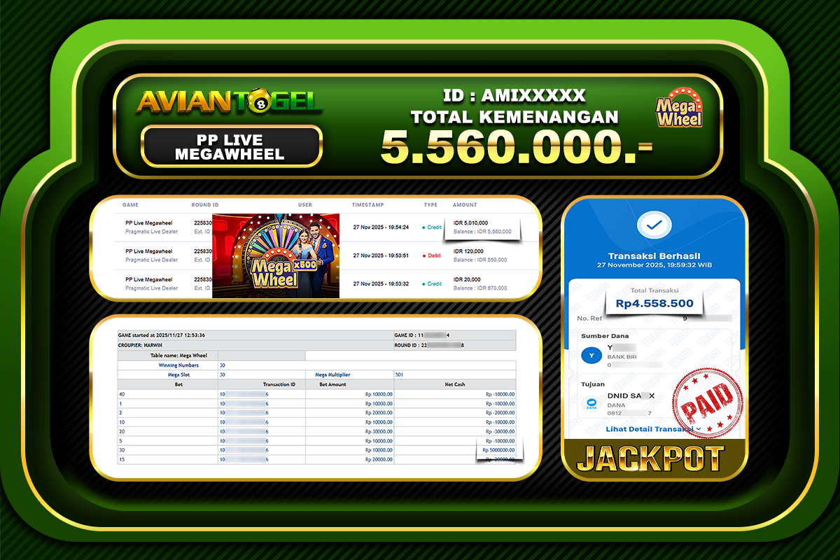 BUKTI PEMBAYARAN SLOT AVIANTOGEL Rp.5,560,000,- GAME : SLOT PP LIVE MEGAWHELL (USER ID : AMIXXXXX) TANGGAL |26-02-2026| CASH LUNAS !