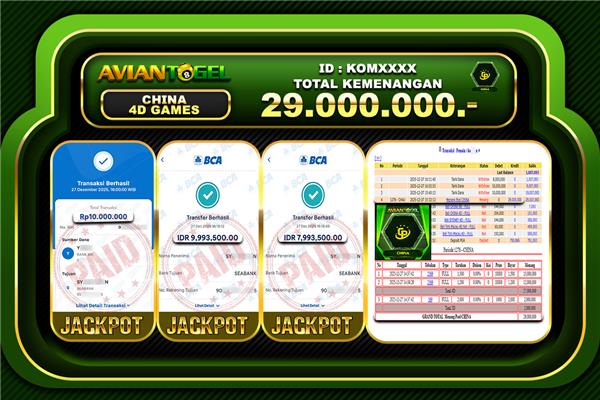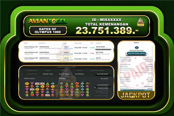 Beberapa situs togel online hanya menjanjikan tanpa ada bukti yang jelas, tapi di AVIANTOGEL semua pasti terbukti dan jelas, BUKTI JACKPOT TOTO TOGEL ONLINE, SLOT ONLINE, LIVE CASINO secara nyata. Melalui kemenangan member setiap hari nya, jackpot besar togel online 2D–3D–4D maupun jackpot besar slot gacor, hingga bukti transaksi kemenangan yang benar-benar masuk ke saldo member.