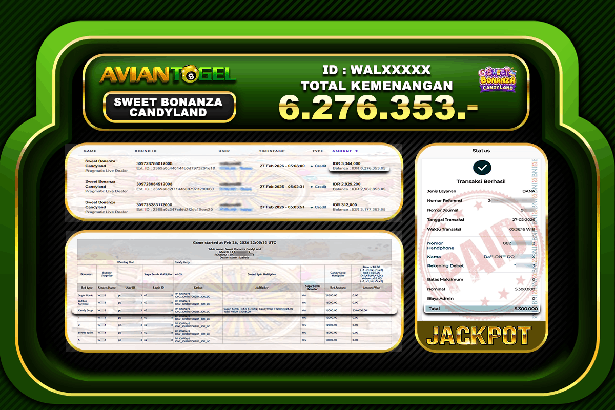 BUKTI PEMBAYARAN SLOT AVIANTOGEL Rp.6,276,353,- GAME : SWEET BONANZA CANDYLAND (USER ID : WALXXXXX ) TANGGAL |25-02-2026| CASH LUNAS !