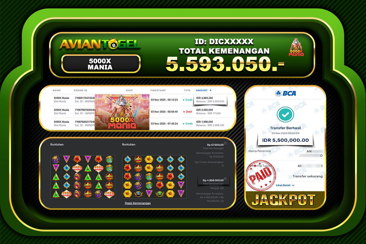 BUKTI PEMBAYARAN SLOT AVIANTOGEL Rp.5,593,050,- GAME : SLOT 5000X MANIA
