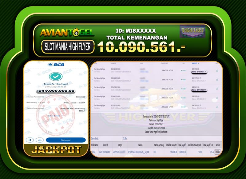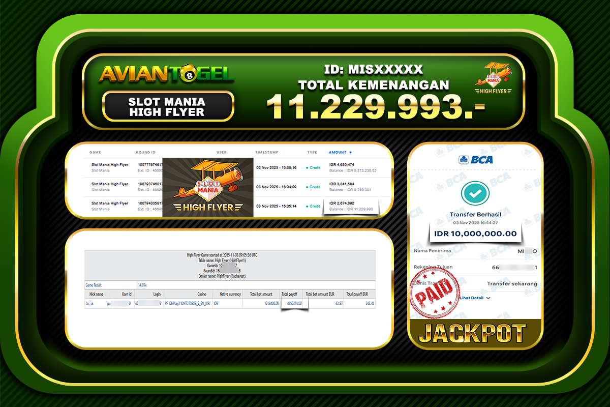 BUKTI PEMBAYARAN SLOT AVIANTOGEL Rp.11,229,993,- GAME : SLOT MANIA HIGH FLYER