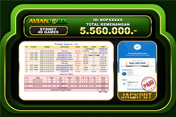 BUKTI PEMBAYARAN AVIANTOGEL Rp.5,560,000,- GAME : TOGEL SYDNEY 4D GAMES