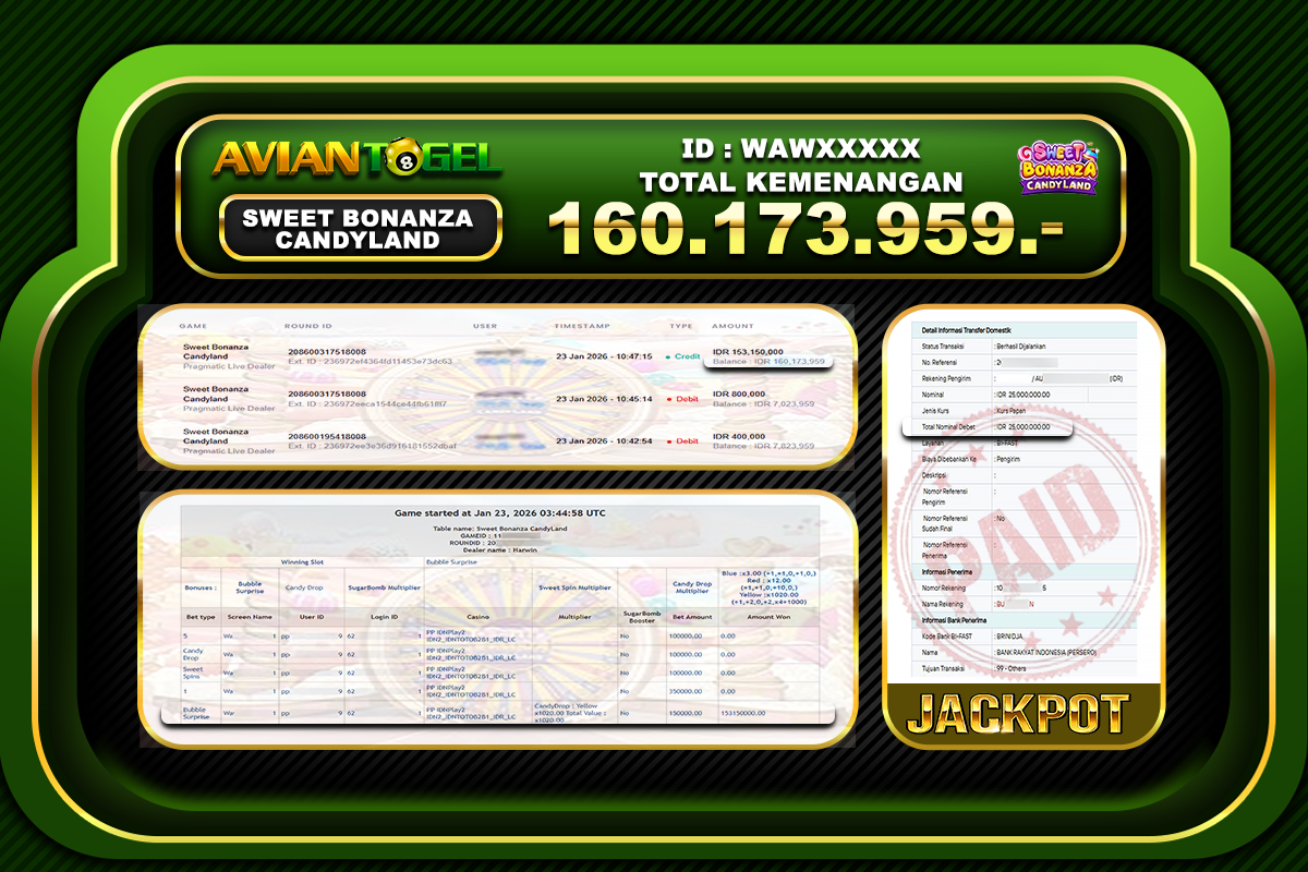 BUKTI PEMBAYARAN SLOT AVIANTOGEL Rp.160,173,959,- GAME : SLOT SWEEET BONANZA CANDYLAND