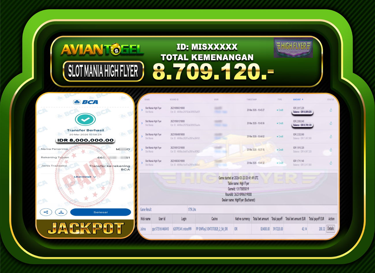 BUKTI PEMBAYARAN SLOT AVIANTOGEL Rp.8,709,120,- GAME : SLOT SLOT MANIA HIGHFLYER