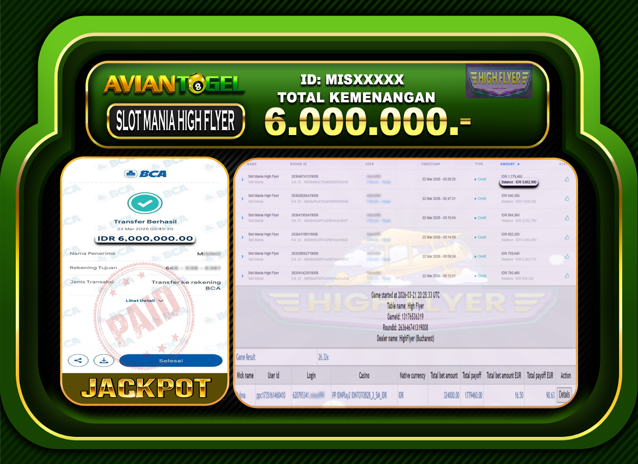 BUKTI PEMBAYARAN SLOT AVIANTOGEL Rp.6,000,000,- GAME : SLOT MANIA HIGHFLYER