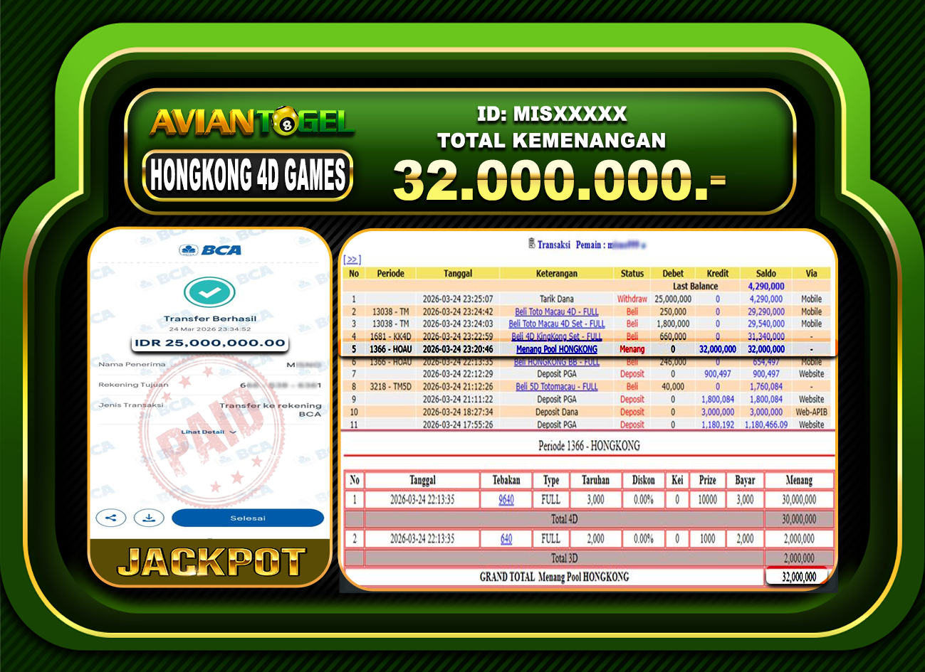 BUKTI PEMBAYARAN AVIANTOGEL Rp.32,000,000,- GAME : TOGEL HONGKONG 4D GAMES