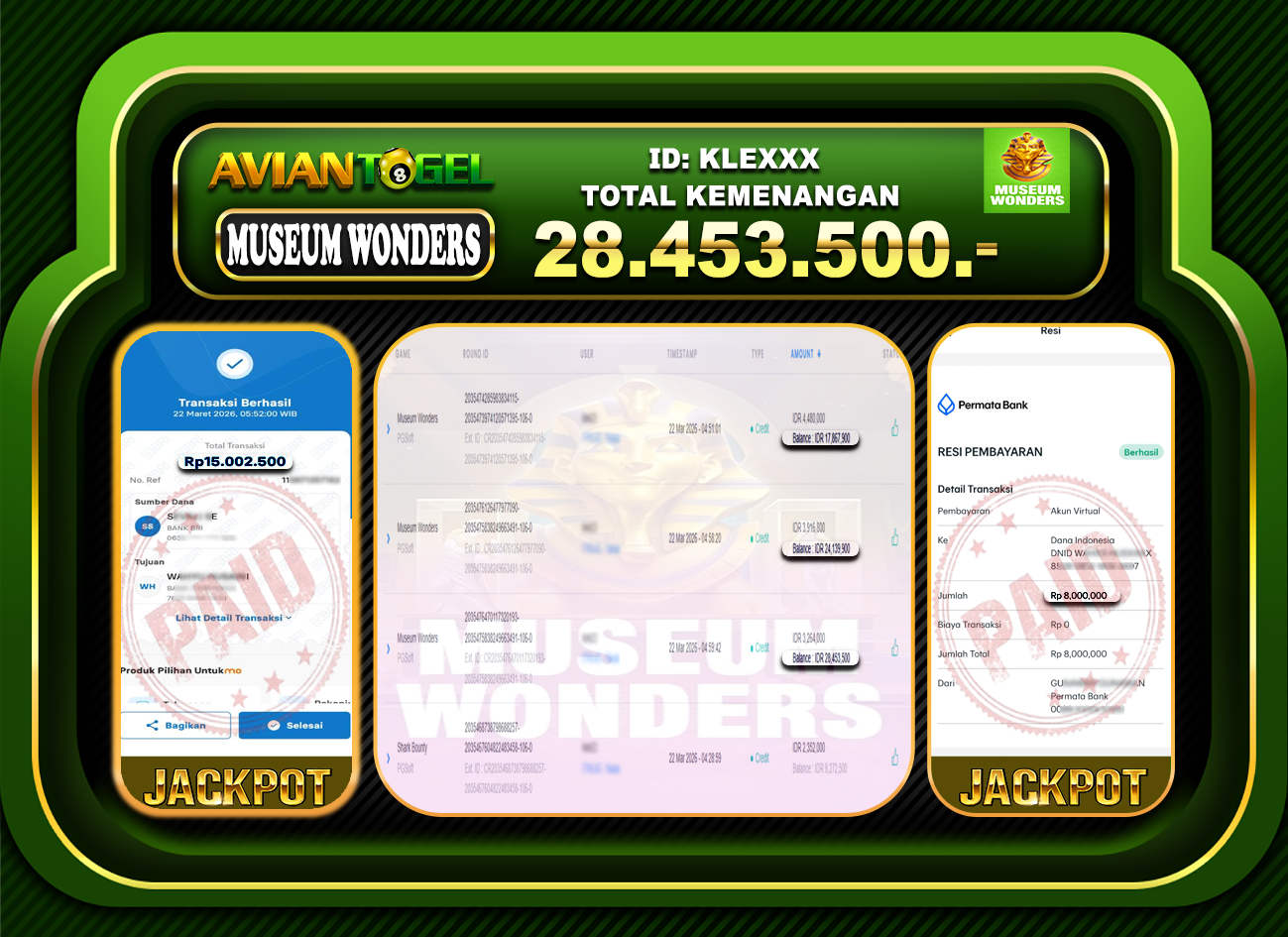 BUKTI PEMBAYARAN SLOT AVIANTOGEL Rp.28,453,500,- GAME : SLOT MUSEUM WONDERS