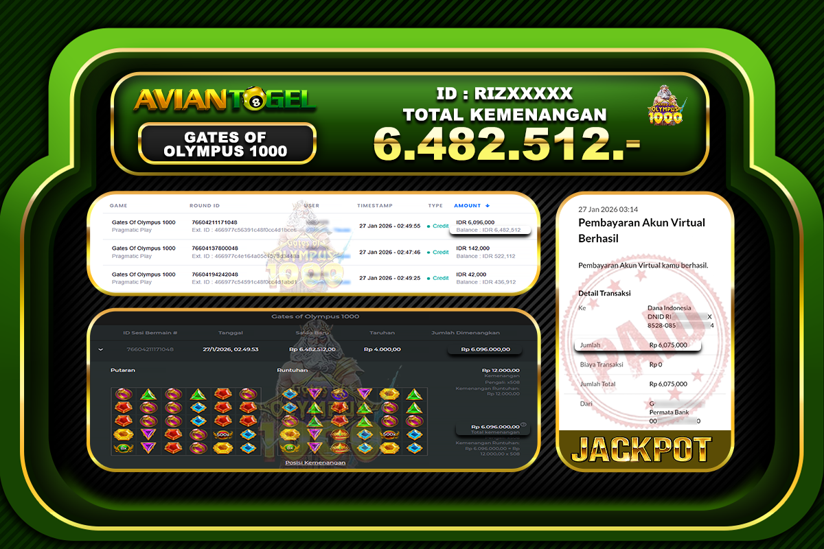 BUKTI PEMBAYARAN SLOT AVIANTOGEL Rp.6,482,512,- GAME : SLOT GATES OF OLYMPUS 1000