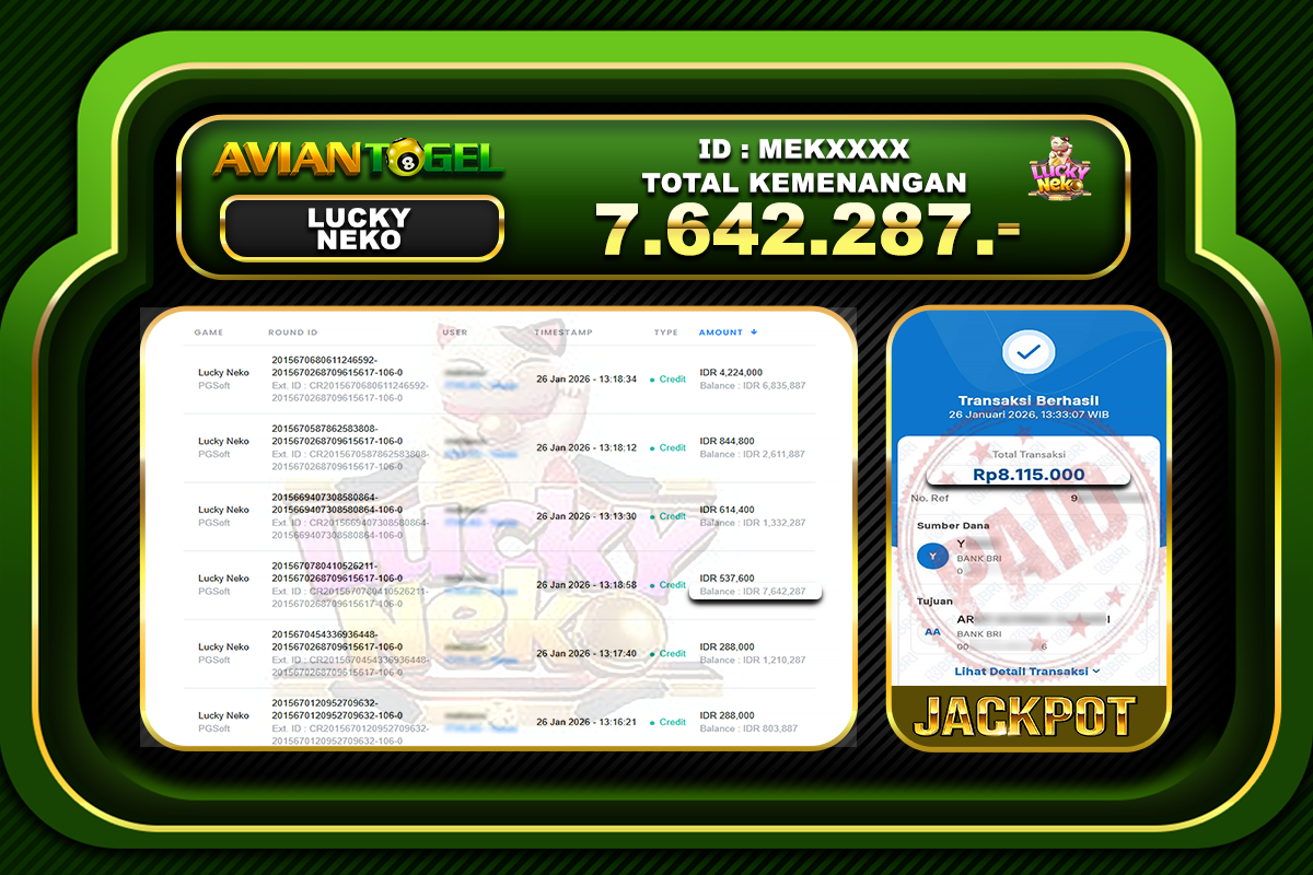 BUKTI PEMBAYARAN SLOT AVIANTOGEL Rp.7,642,287,- GAME : SLOT LUCKY NEKO