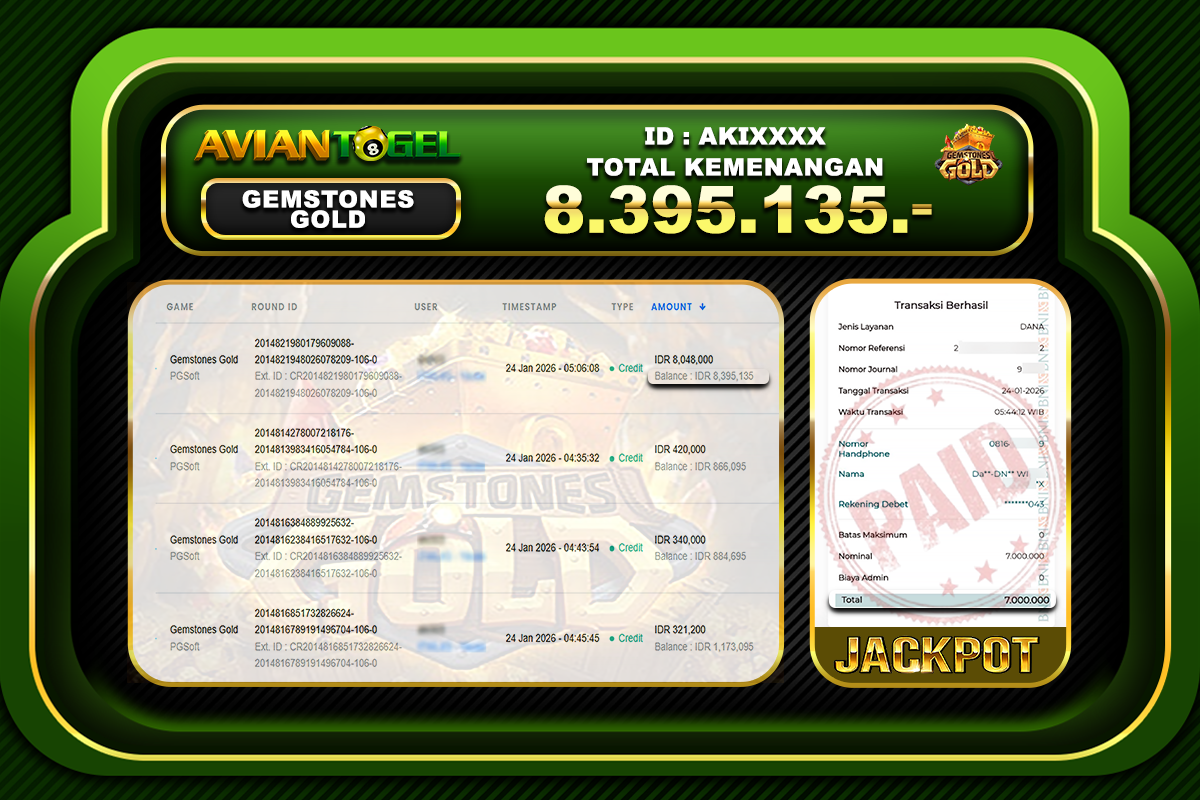 BUKTI PEMBAYARAN SLOT AVIANTOGEL Rp.8,395,135,- GAME : SLOT GEMSTONES GOLD