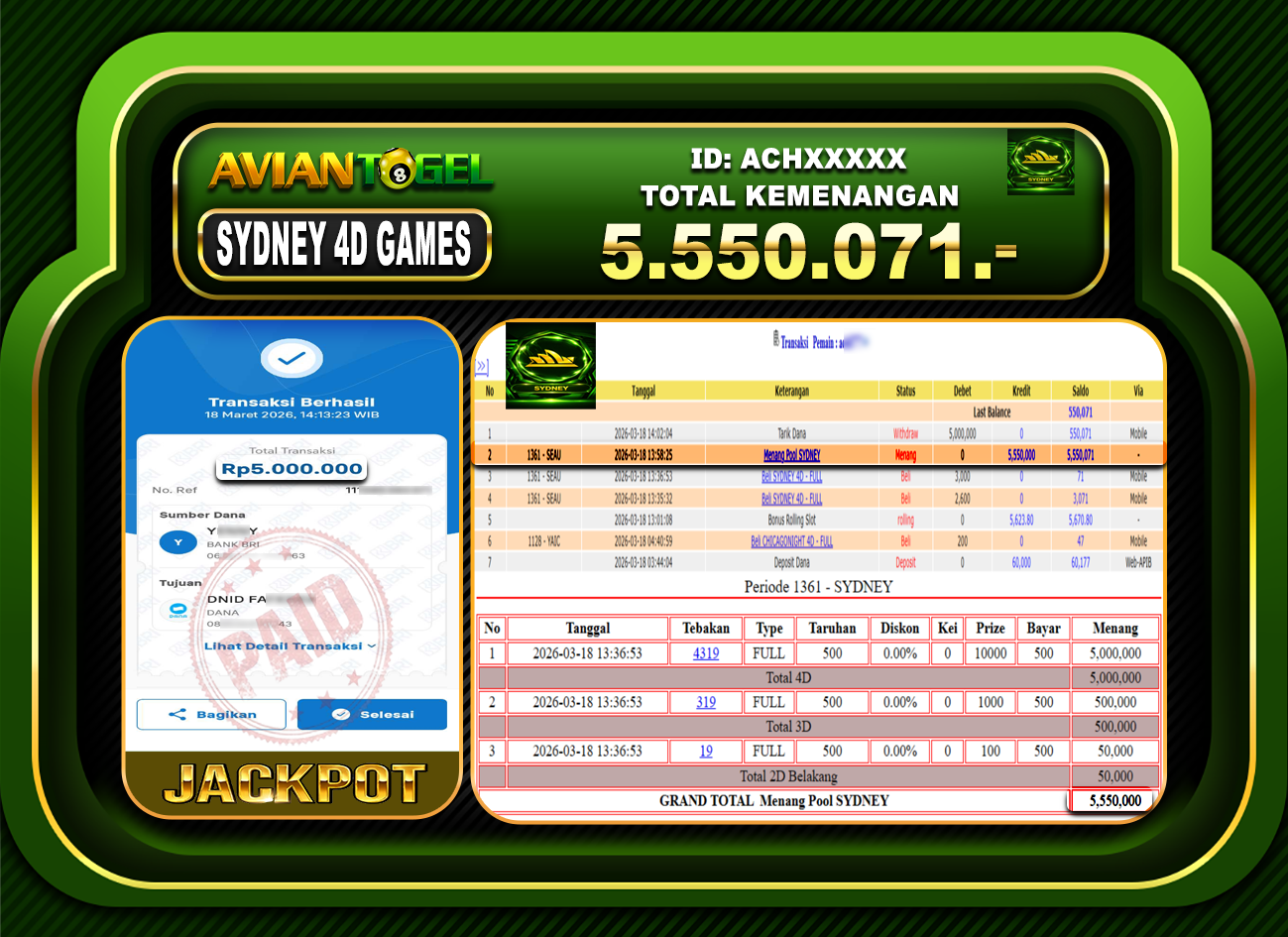 BUKTI PEMBAYARAN AVIANTOGEL Rp.5,550,071,- GAME : TOGEL SYDNEY 4D GAMES