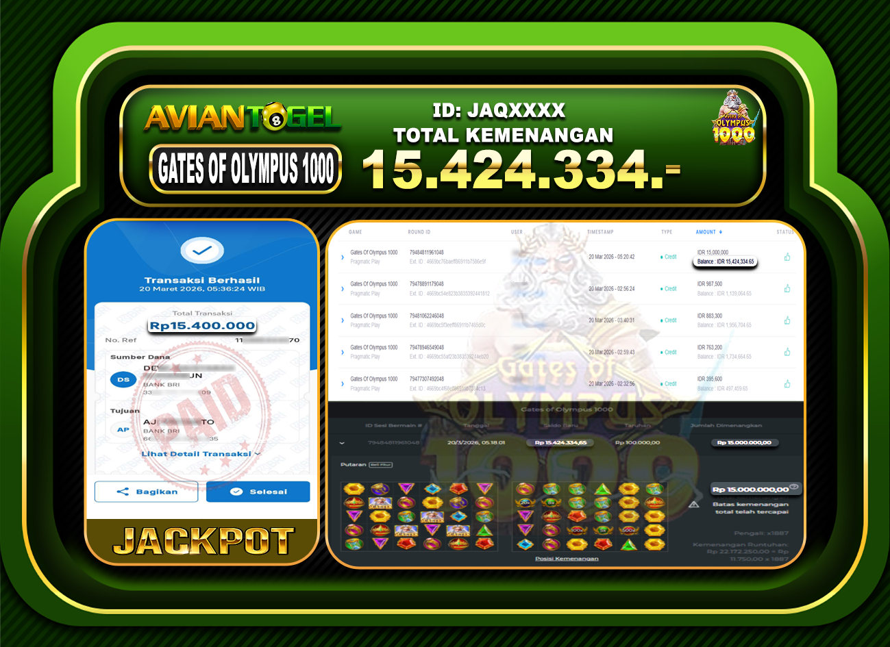 Beberapa situs togel online hanya menjanjikan tanpa ada bukti yang jelas, tapi di AVIANTOGEL semua pasti terbukti dan jelas, BUKTI JACKPOT TOTO TOGEL ONLINE, SLOT ONLINE, LIVE CASINO secara nyata. Melalui kemenangan member setiap hari nya, jackpot besar togel online 2D–3D–4D maupun jackpot besar slot gacor, hingga bukti transaksi kemenangan yang benar-benar masuk ke saldo member.