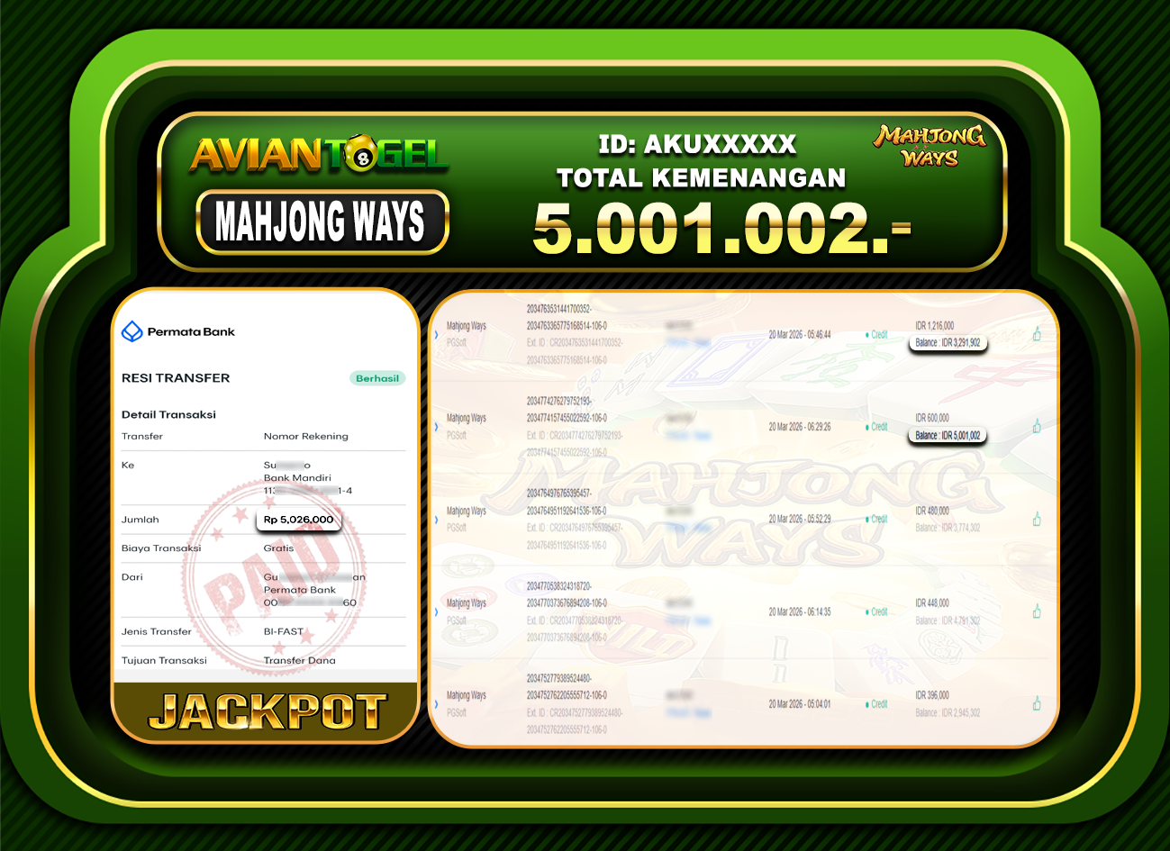 BUKTI PEMBAYARAN SLOT AVIANTOGEL Rp.5,001,002,- GAME : SLOT MAHJONG WAYS