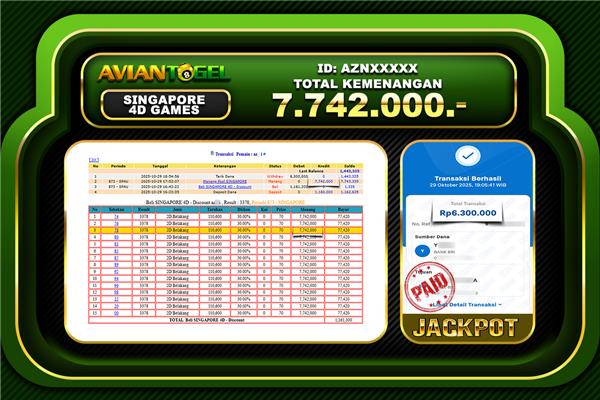 BUKTI PEMBAYARAN AVIANTOGEL Rp.7,742,000,- GAME : TOGEL SINGAPORE 4D GAMES