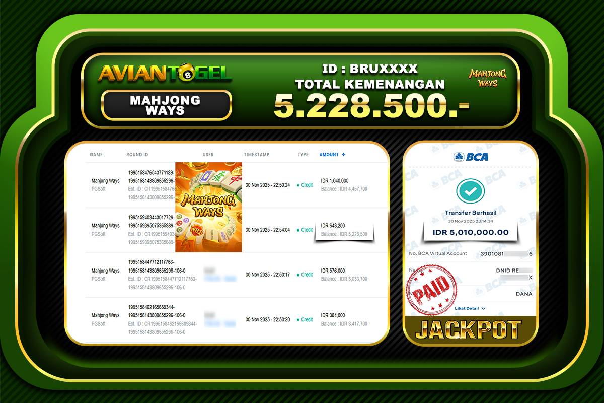 BUKTI PEMBAYARAN SLOT AVIANTOGEL Rp.5,228,500,- GAME : SLOT MAHJONG WAYS